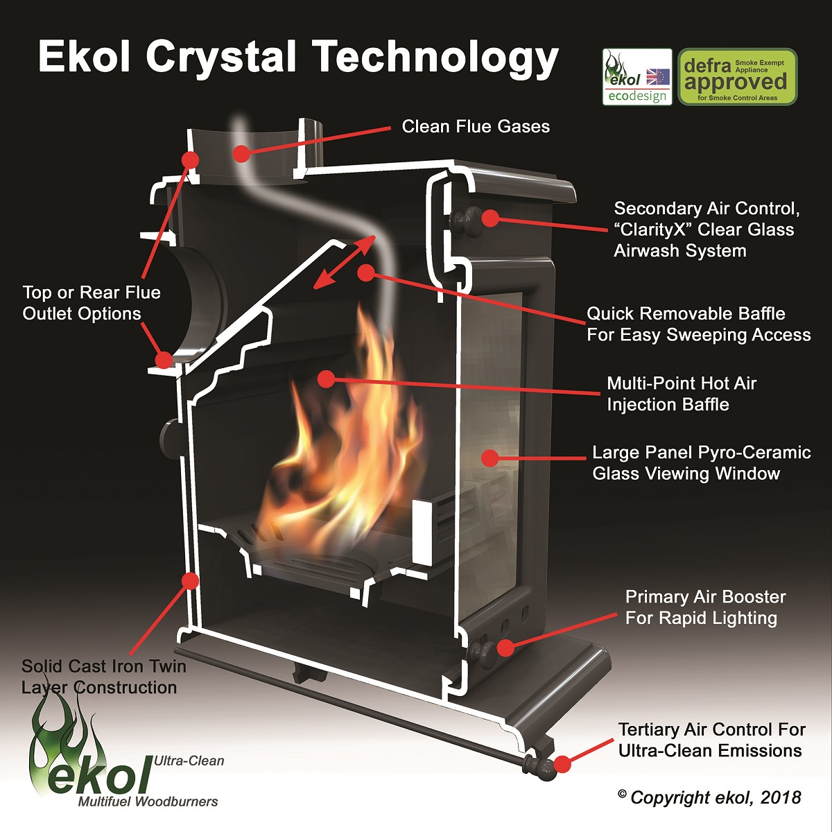 The Crystal 5 features all-cast-iron construction for maximum heat-retention and ultra-clean-burning, by keeping the belly of the fire hot even during ‘low & slow’ burning. Cast Iron construction also makes for an extremely rugged stove with long life.