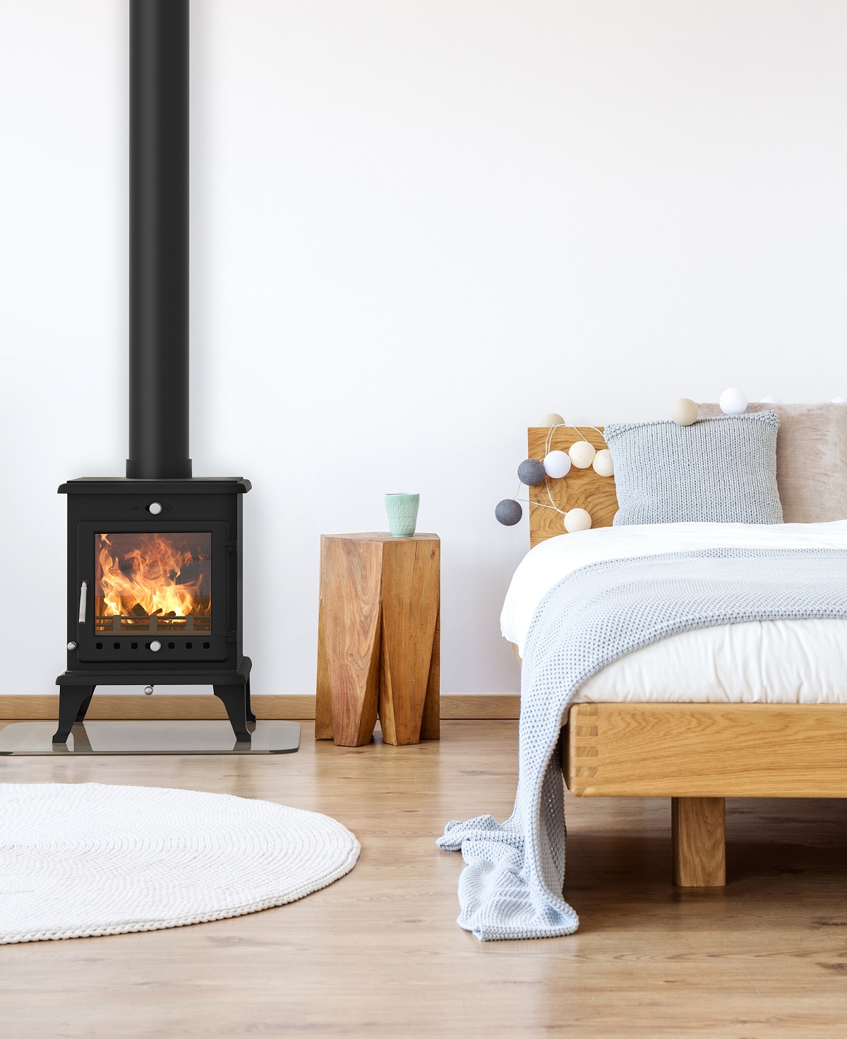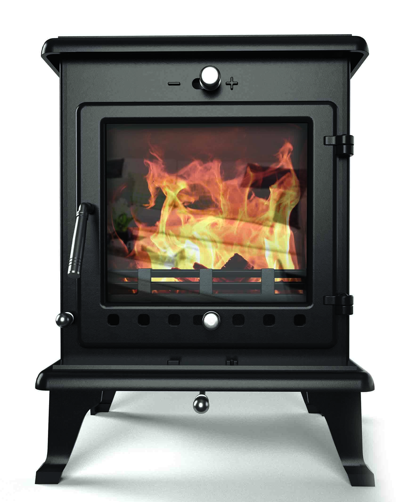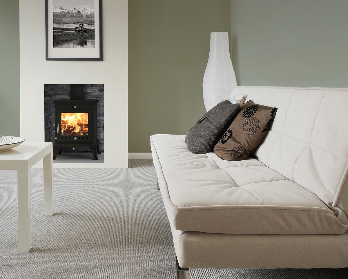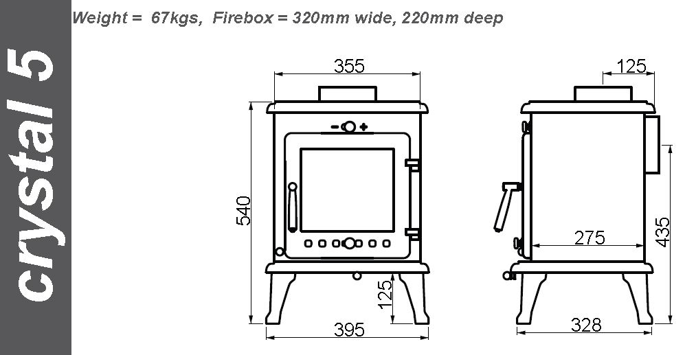 The compact Crystal 5 – Rated at 5kW it can heat a decent sized room easily, with easy variable output between 1 and 5kW. Its viewing window is huge for a compact stove! 'Crystal 5' – can fit a ‘standard small’ UK chimney opening of 16” wide. – This can make some installations so much simpler and easier – rarely would any building / alteration work need to be done even with a small chimney opening.