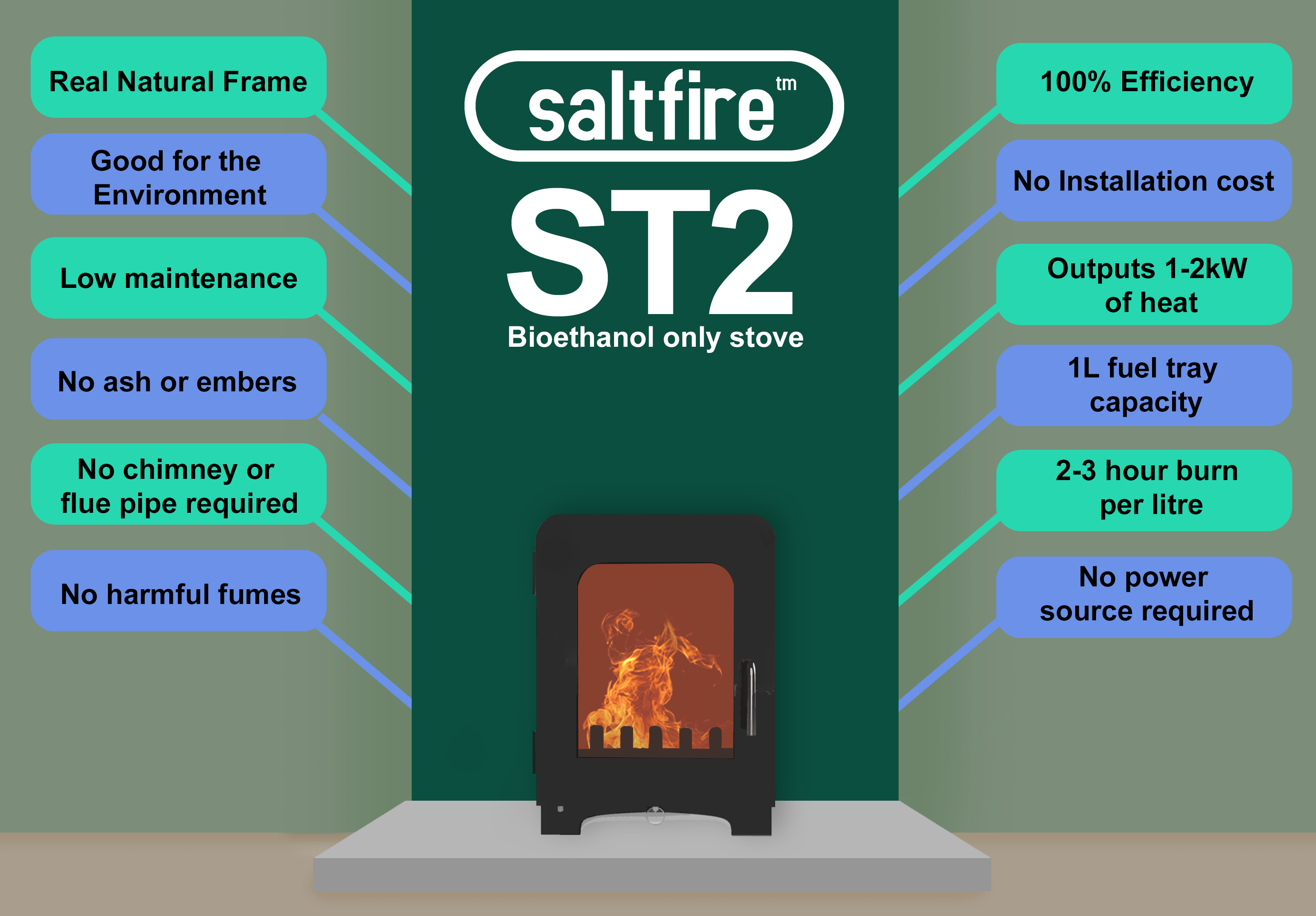 The popular Saltfire ST2 Model is now available as a Bioethanol only fuel stove.
